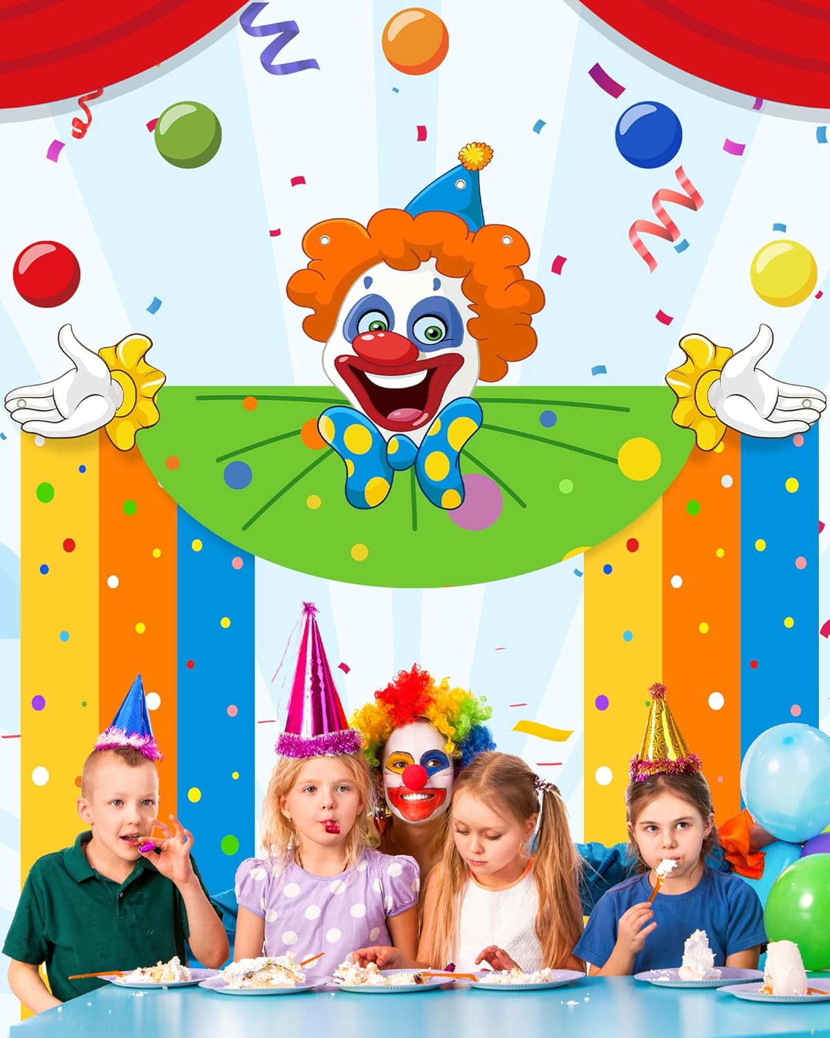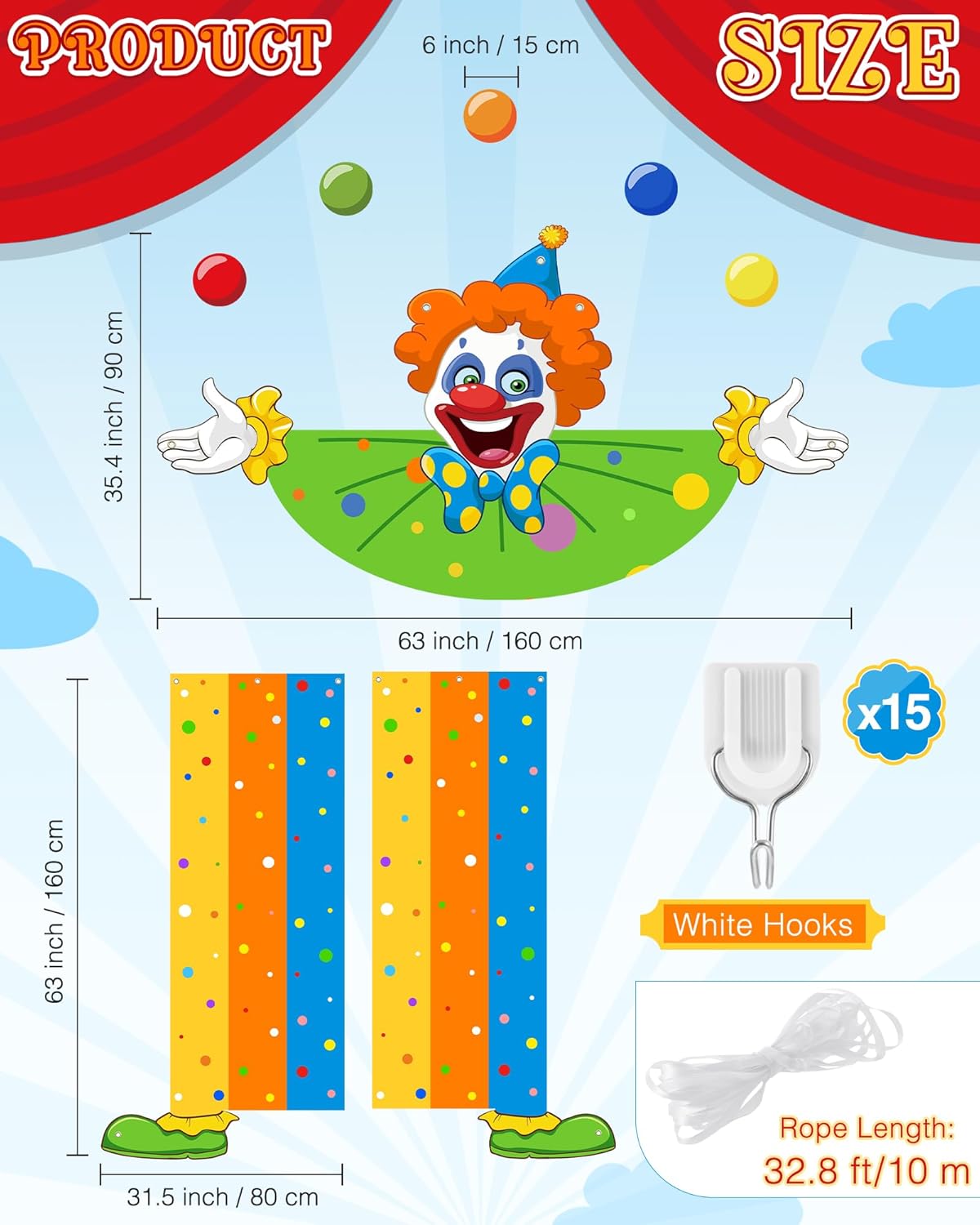 Circus door covers: 160*80cm/ 63 x 31.5 inch - Inclusions: 3 x Clown Banner, 15 x Hooks